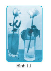 Hãy cùng với nhóm của mình thực hiện các thí nghiệm hình 1.1. Dùng dao có lưỡi mỏng (lưỡi dao cạo) xẻ cuống mỗi cành hoa làm hai rồi cắm vào 2 cốc đựng nước màu khác nhau.