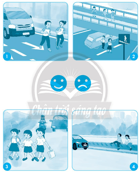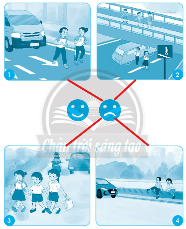 Tranh 2: Có cầu vượt dành cho người đi bộ, biển báo cầu vượt nhưng có 2 học sinh nam, nữ đi qua đường phía dưới, không đi bằng cầu vượt. (Không đồng tình)