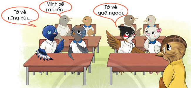 Trong tranh là một lớp học. Đây là buổi học cuối năm trước khi nghỉ hè. Trong đó, các bạn học sinh là các chú chim nhỏ đang háo hức kể về nơi mình sẽ đi đến lúc nghỉ hè. Bạn sẽ về rừng núi, bạn về quê ngoại, bạn thì ra biển. Ở trên bục giảng, cô giáo chim đang dịu dàng nhìn các học sinh của mình.