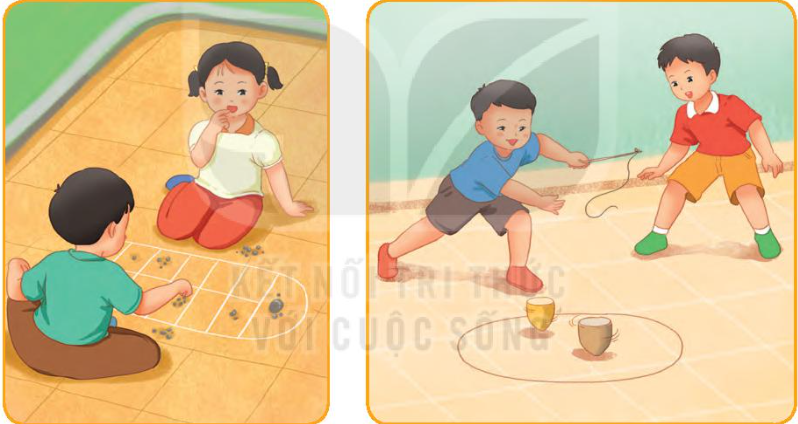 Các bạn nhỏ chơi ô ăn quan và đánh quay.