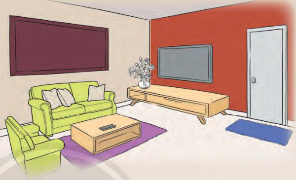 1. Các đồ vật có trong bức tranh là: tivi, bàn ghế, bình hoa, cánh cửa, tấm thảm, cái bảng.