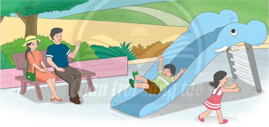 - Bố mẹ đang ngồi ở ghế đá xem hai chị em chơi cầu trượt.