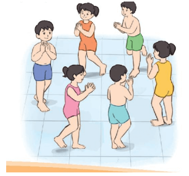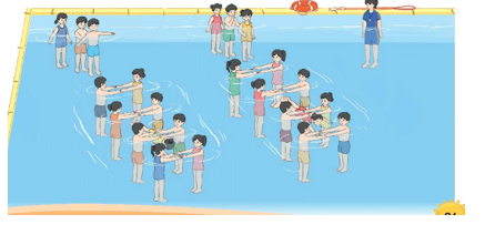 Em thực hiện động tác đạp đáy bể (hồ) bơi nhô đầu kết hợp thở trong nước khi đi bơi cùng người thân.