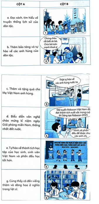 Em hãy lựa chọn những lời nói, việc làm ở cột A để nối với tranh ở cột B sao cho phù hợp với việc thể hiện lòng biết ơn những người có công với quê hương, đất nước.