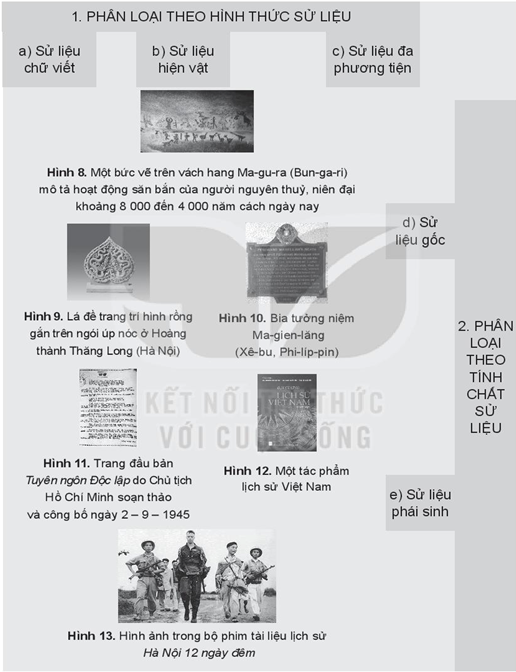 - Căn cứ vào hình thức, có sử liệu hiện vật, sử liệu truyền miệng, sử liệu chữ viết, sử liệu hình ảnh, sử liệu đa phương tiện,…