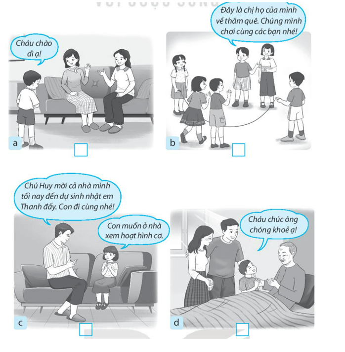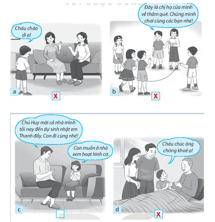 Đánh dấu X vào ô trống dưới những hình thể hiện việc em nên làm đối với các thành viên trong gia đình họ hàng.