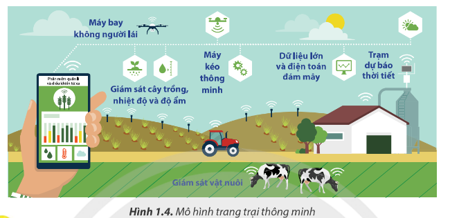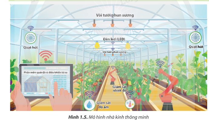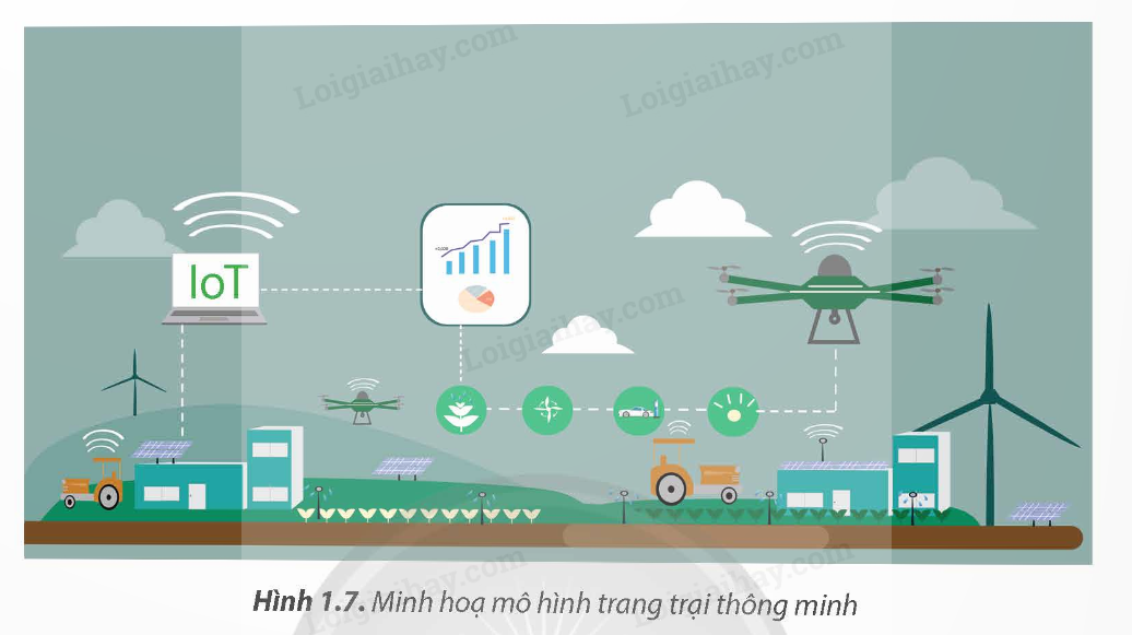 Em hãy tìm hiểu mô hình nông nghiệp công nhệ cao như minh họa ở hình 1.7 và cho biết tên, vai trò của các thiết bị công nghệ được sử dụng trong mô hình.