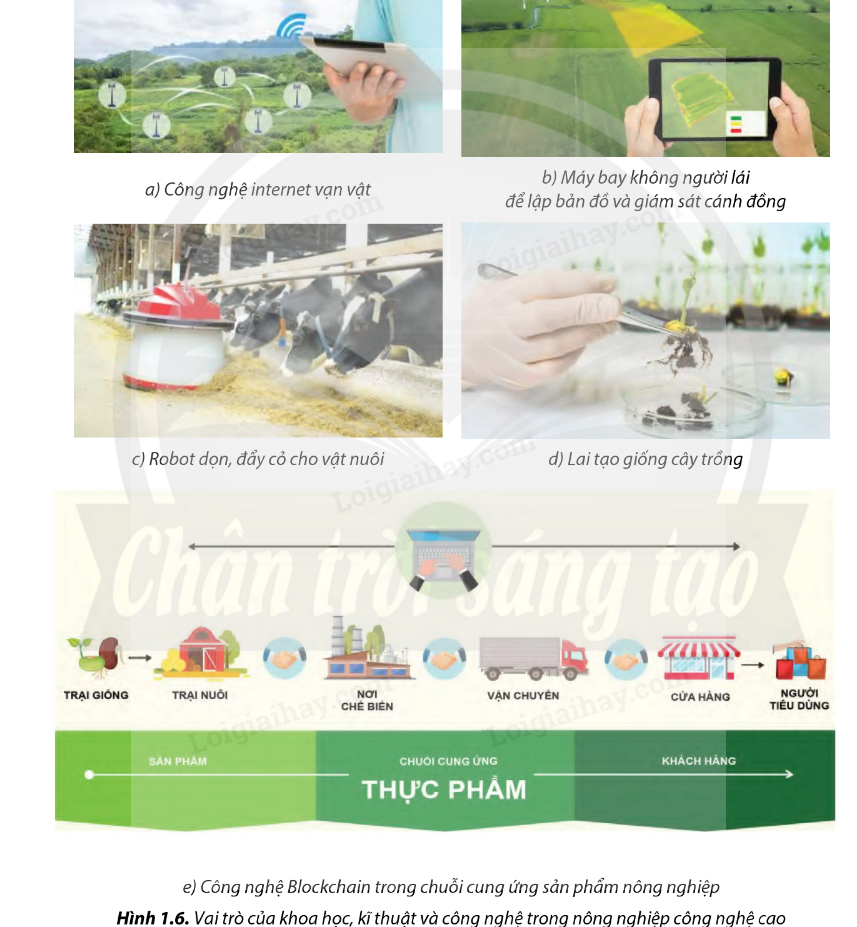 - Hình 1.6 thể hiện vai trò quan trọng của khoa học, kỹ thuật, công nghệ trong nông nghiệp thông qua các ứng dụng cụ thể ở từng khâu của chuỗi cung ứng nông sản: