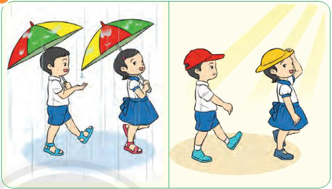 - Tranh 2: Trời nắng và các bạn nhỏ đội mũ.