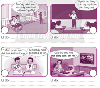 Bức tranh 3: Em không đồng tình vì thể hiện sự chê bai và không tôn trọng với nghề của bạn, điều này là không tốt vì mọi công việc đều quan trọng và cần được tôn trọng. (Vẽ ☹)
