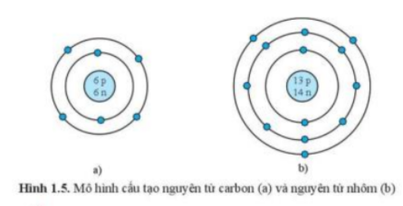 Quan sát hình ảnh mô tả cấu tạo nguyên tử carbon và nhôm (hình 1.5), hãy cho biết mỗi nguyên tử đó có bao nhiêu lớp electron và số electron trên mỗi lớp electron đó.