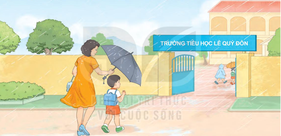 Ngày trời mưa, bạn nhỏ được mẹ đưa đến trường. Mẹ nghiêng ô về phía bạn để che chắn cho bạn không bị ướt.