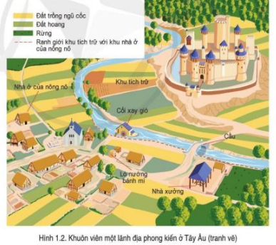 Đọc thông tin và quan sát các hình 1.2, 1.3 hãy trình bày đặc điểm kinh tế và xã hội trong lãnh địa phong kiến ở Tây Âu.