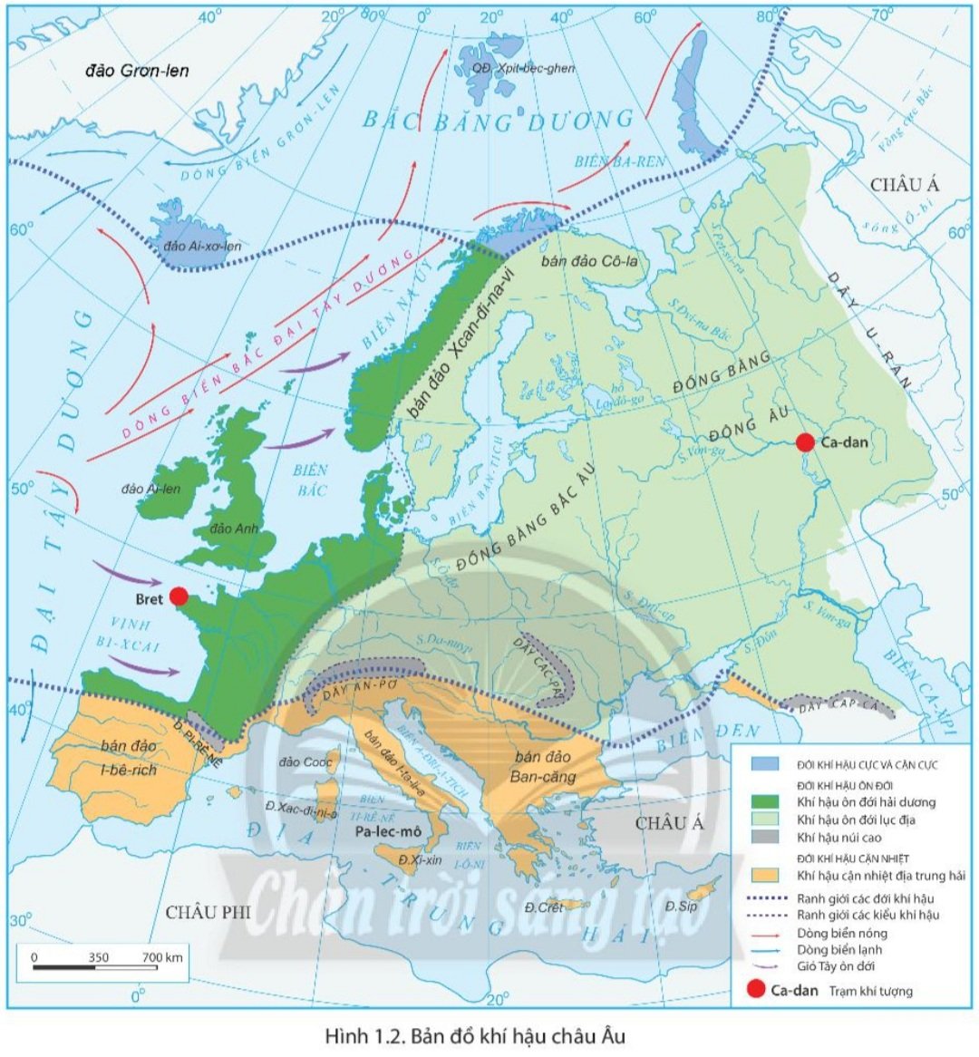 * Đặc điểm phân hóa khí hậu ở châu Âu: khí hậu phân hóa đa dạng thành các đới và kiểu khí hậu.