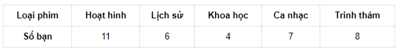 Điều tra loại phim yêu thích nhất của 36 học sinh lớp 6A3, bạn lớp trưởng thu được bảng dữ liệu ban đầu như sau: