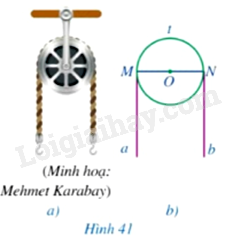 Giả sử ròng rọc được minh họa bởi đường tròn (left( O right)), sợi dây vắt qua ròng rọc được minh hoạ bởi cung (MtN) và hai tiếp tuyến (Ma,Nb) của đường tròn (left( O right)) (Hình 41b). Chứng minh (Ma//Nb).