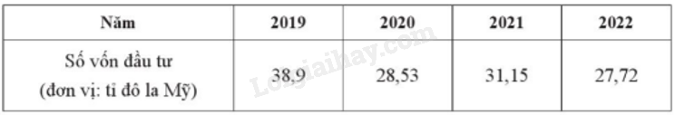 Số vốn đầu tư nước ngoài (đơn vị: tỉ đô la Mỹ) đăng kí vào Việt Nam trong các năm 2019, 2020, 2021, 2022 lần lượt là: 38,9; 28,53; 31,15; 27,72. (Nguồn: Tổng cục Thống kê). Lập bảng thống kê biểu diễn các số liệu đó.