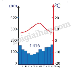- Địa điểm này thuộc đới khí hậu khí hậu ôn đới (em đã tìm hiểu trong bài 13). Vì đới khí hậu ôn đới có nhiệt độ trung bình, lượng mưa từ 500 - 1500 mm (trong biểu đồ lượng mưa đạt 1416 mm).