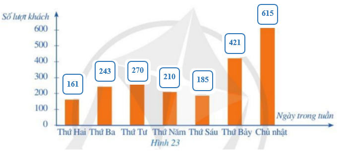 b) Hãy hoàn thiện biểu đồ ở Hình 23 để nhận được biểu đồ cột biểu diễn các dữ liệu thống kê số lượt khách đến cửa hàng trong những ngày đó.