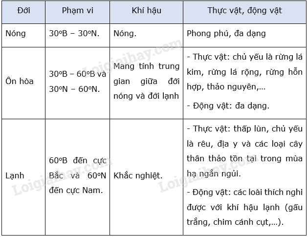 Quan sát hình 2 SGK và dựa vào kiến thức về các đới thiên nhiên trên Trái Đất để hoàn thành bảng.