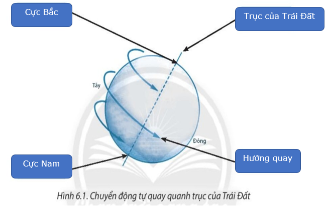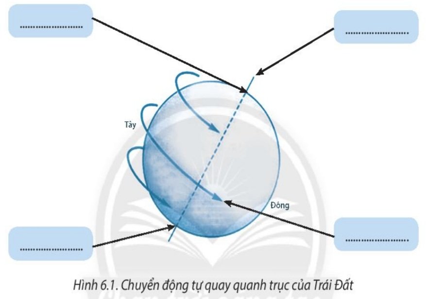 Hãy điền các nội dung thích hợp vào chỗ trống (...) trong hình sau để thể hiện chuyển động tự quay quanh trục của Trái Đất.