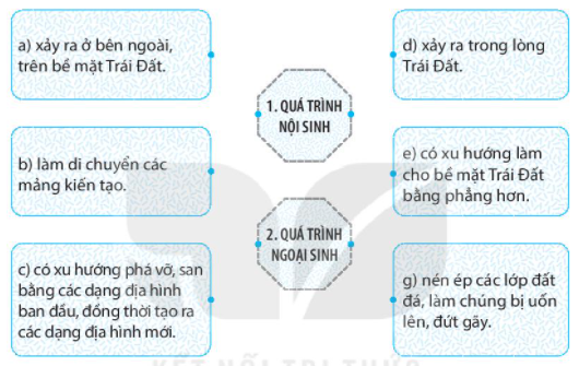 - Nội sinh là quá trình xảy ra trong lòng Trái Đất. Quá trình nội sinh làm di chuyển các mảng kiến tạo, nén ép các lớp đất đá. làm cho chúng bị uốn nếp, đứt gãy hoặc đẩy vật chất nóng chảy ở dưới sâu ra ngoài mặt đất tạo thành núi lửa, động đất,...