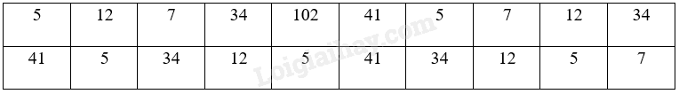 Tần số của các giá trị 5; 7; 12; 34; 41; 102 lần lượt là 5; 3; 4; 4; 3; 1.