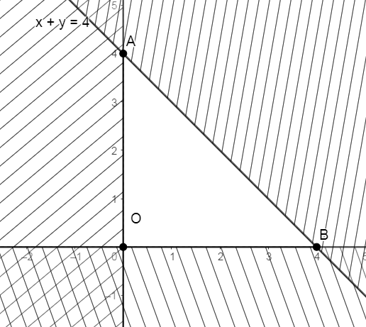 Miền không gạch chéo (kể cả bờ là các đoạn thẳng OA, OB và BC ) của ba bất phương trình dưới và không tính bờ là đoạn thẳng AC của bất phương trình thứ nhất là phần giao của bốn miền nghiệm của bốn bất phương trình và cũng là phần biểu diễn miền nghiệm của hệ bất phương trình đã cho