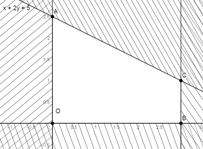 b) Hệ đã cho được viết lại thành \(\left\{ \begin{array}{l}x + 2y - 5 < 0\\x \ge 0\\x \le 3\\y \ge 0\end{array} \right.\)
