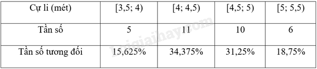 b) Hãy chia số liệu thành 4 nhóm, trong đó nhóm đầu tiên là cự li từ 3,5 m đến dưới 4 m; lập bảng tần số và tần số tương đối ghép nhóm.