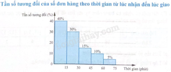 b) Dựa vào biểu đồ ta thấy thời gian từ lúc nhận đến lúc giao hàng phổ biến nhất là khoảng [0; 15) phút.