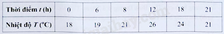 Thống kê nhiệt độ \(T\left( {^\circ C} \right)\) tại một địa điểm thuộc vùng ôn đới ở một số thời điểm \(t\left( h \right)\) trong một ngày được cho bởi bảng sau: