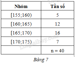 Khi thống kê chiều cao của 40 bạn lớp 11A, ta thu được mẫu số liệu ghép nhóm được cho ở Bảng 7 (đơn vị: centimét).