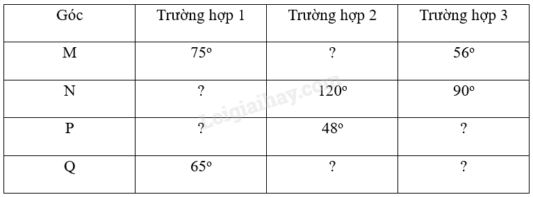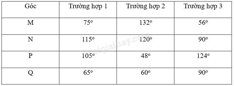 Cho MNPQ là tứ giác nội tiếp. Hãy tìm các góc chưa biết của tứ giác MNPQ trong mỗi trường hợp sau: