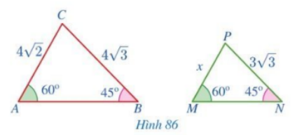 \(\begin{array}{l} \Rightarrow \frac{{4\sqrt 2 }}{x} = \frac{{4\sqrt 3 }}{{3\sqrt 3 }}\\ \Rightarrow x = \frac{{4\sqrt 2 .3\sqrt 3 }}{{4\sqrt 3 }} = 3\sqrt 2 \end{array}\)