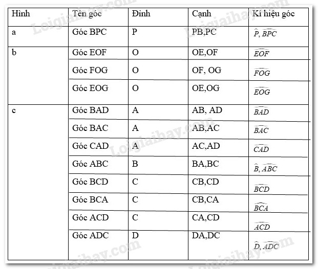 Lập bảng thống kê các yếu tố của các góc trong mỗi hình dưới đây (theo mẫu).
