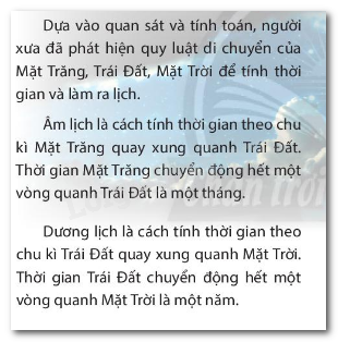 Dựa vào quan sát và tính toán, người xưa đã phát hiện quy luật di chuyển của Mặt Trăng, Trái Đất, Mặt Trời để tính thời gian và làm ra lịch.