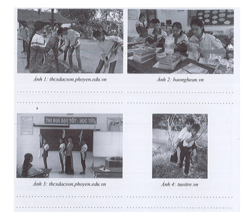 - Ảnh 1 - Các bạn học sinh đang dọn dẹp tại khu danh lam thắng cảnh/ di tích lịch sử, văn hóa tại địa phương => đây là hành động góp phần giữ gìn truyền thống quê hương.