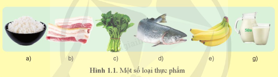 Hãy kể tên một số chất dinh dưỡng chính có trong thực phẩm ở Hình 1.1.