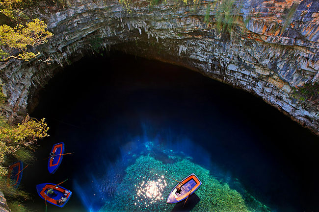 Nước trong động Melissani trong vắt tựa pha lê, khiến bạn ngồi trên thuyền mà cứ như thể mình đang lướt trên không trung vậy. Ngay giữa lòng động là một cổng trời lớn, do lớp đá trên cao sụp xuống hàng ngàn năm về trước tạo thành.