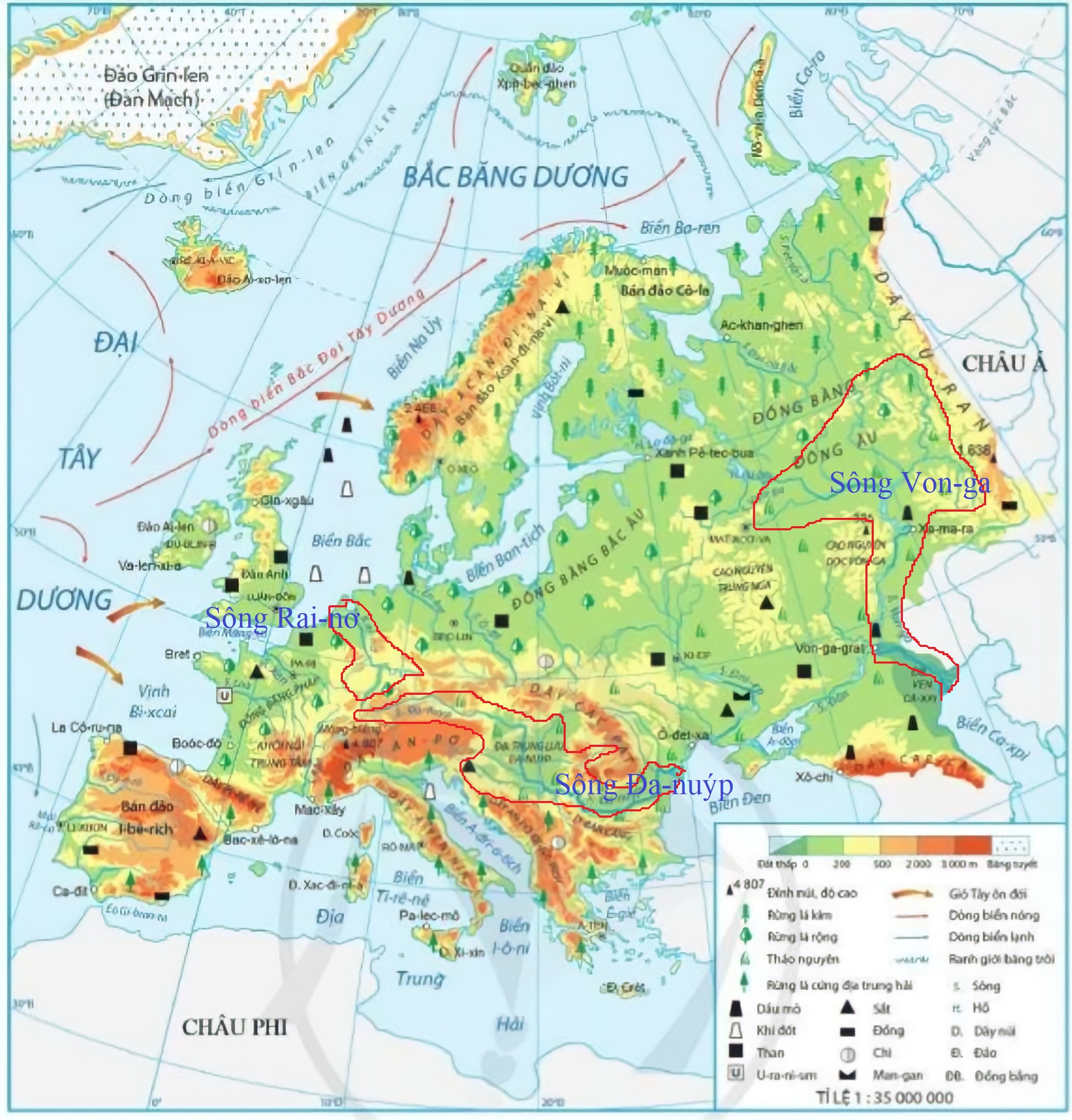 Xác định các sông lớn ở châu Âu: Rai-nơ, Đa-nuýp, Vôn-ga (Khoanh đỏ):