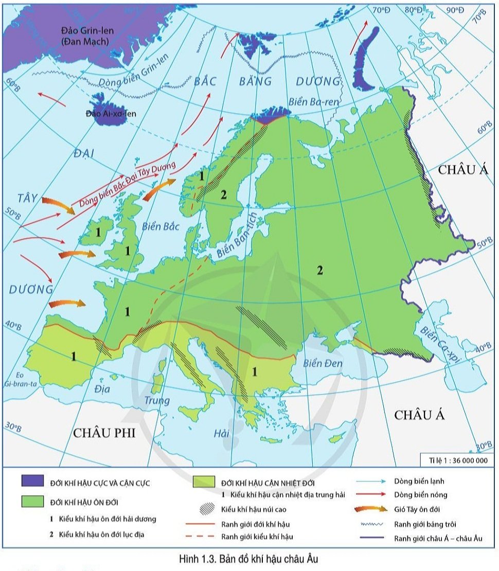 Đọc thông tin và quan sát hình 1.3, hãy phân tích sự phân hóa khí hậu ở châu Âu.