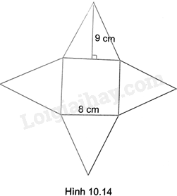 Sau khi cắt và gấp miếng bìa như Hình 10.14, ta được một hình chóp tứ giác đều. Tính diện tích toàn phần của tứ giác đều tạo thành.