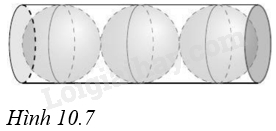 Một hộp đựng bóng bàn có dạng hình trụ chứa vừa khít 3 quả bóng bàn có cùng bán kính R xếp theo chiều ngang (H.10.7). Gọi \({S_1}\) là tổng diện tích của ba quả bóng bàn, \({S_2}\) là diện tích xung quanh của vỏ hộp hình trụ. Tính tỉ số \(\frac{{{S_1}}}{{{S_2}}}\).