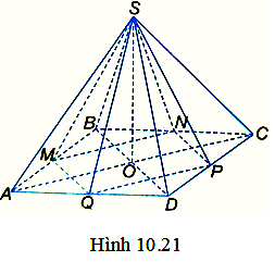 Cho hình chóp tứ giác đều S.ABCD có thể tích bằng \(144c{m^3}\). Gọi M, N, P, Q lần lượt là trung điểm của AB, BC, CD, DA (H.10.21)