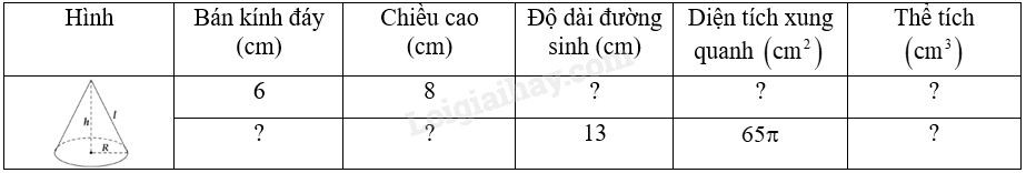 Thể tích của hình nón bán kính r và chiều cao h là: \(V = \frac{1}{3}\pi {r^2}h\).