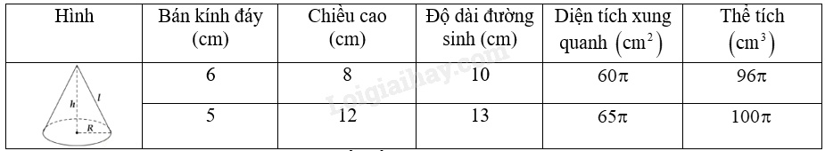 Diện tích xung quanh của hình nón bán kính r và độ dài đường sinh l là: \({S_{xq}} = \pi rl\).