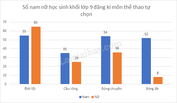 b) Vẽ một biểu đồ biểu diễn dữ liệu ở hai cột thứ hai và thứ ba của bảng. Dùng biểu đồ đã vẽ để nhận xét về sự chênh lệch giữa số học sinh nam và nữ đăng kí ở mỗi môn thể thao.