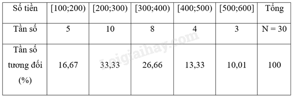 a) Lập bảng tần số - tần số tương đối ghép nhóm, với các nhóm ghép [100;200), [200;300), [300;400), [400;500), [500;600] (làm tròn kết quả đến hàng phần chục nghìn trước khi chuyển sang viết tần số tương đối ở dạng phần trăm).