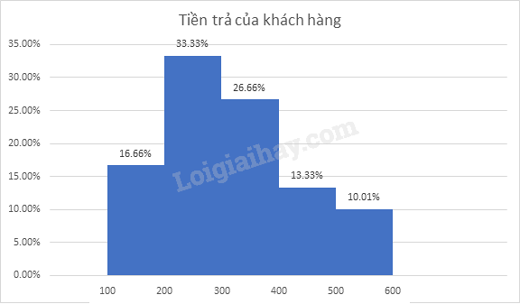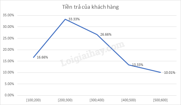 b) Nhóm khách hàng đông nhất là [200;300), nhóm khách hàng ít nhất là [500;600]. Tỉ lệ khách hàng chi tiêu ở mức tối thiểu là 400000 đồng chiếm bao 13,33%.